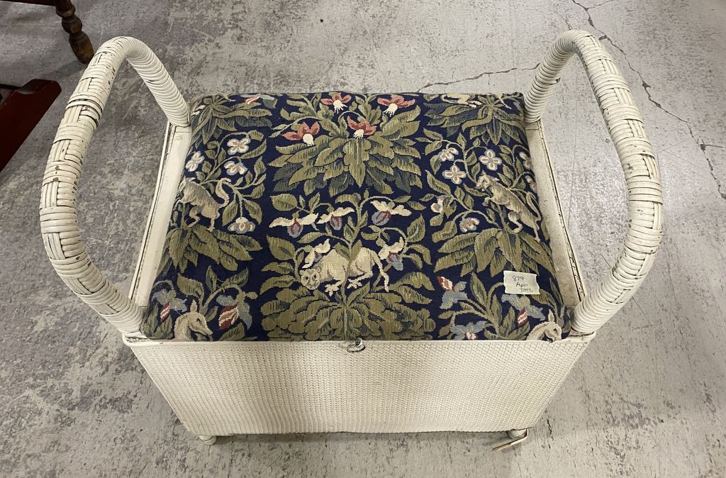White Wicker Painted Bench, sewing bench with lift top storage, 21"h., 22"w. Location Row 3 White Wicker Painted Bench, sewing bench with lift top storage, 21"h., 22"w. Location Row 3
