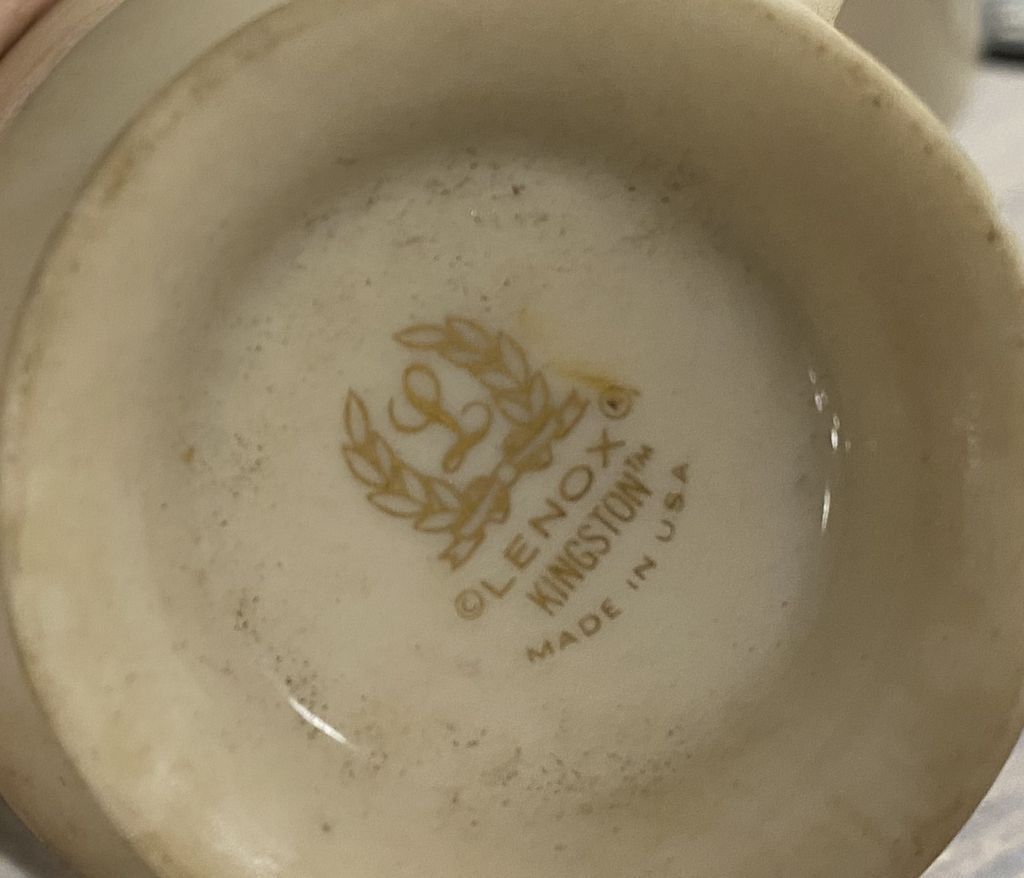 Lenox "Kingston" China Pieces, cups, saucers, bread and butter, dinner plate, Location Right Black Shelves Lenox "Kingston" China Pieces, cups, saucers, bread and butter, dinner plate, Location Right Black Shelves