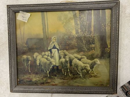 Vintage Lady and Sheep Print, 9" x 11"w, Location Back Metal Shelves Vintage Lady and Sheep Print, 9" x 11"w, Location Back Metal Shelves