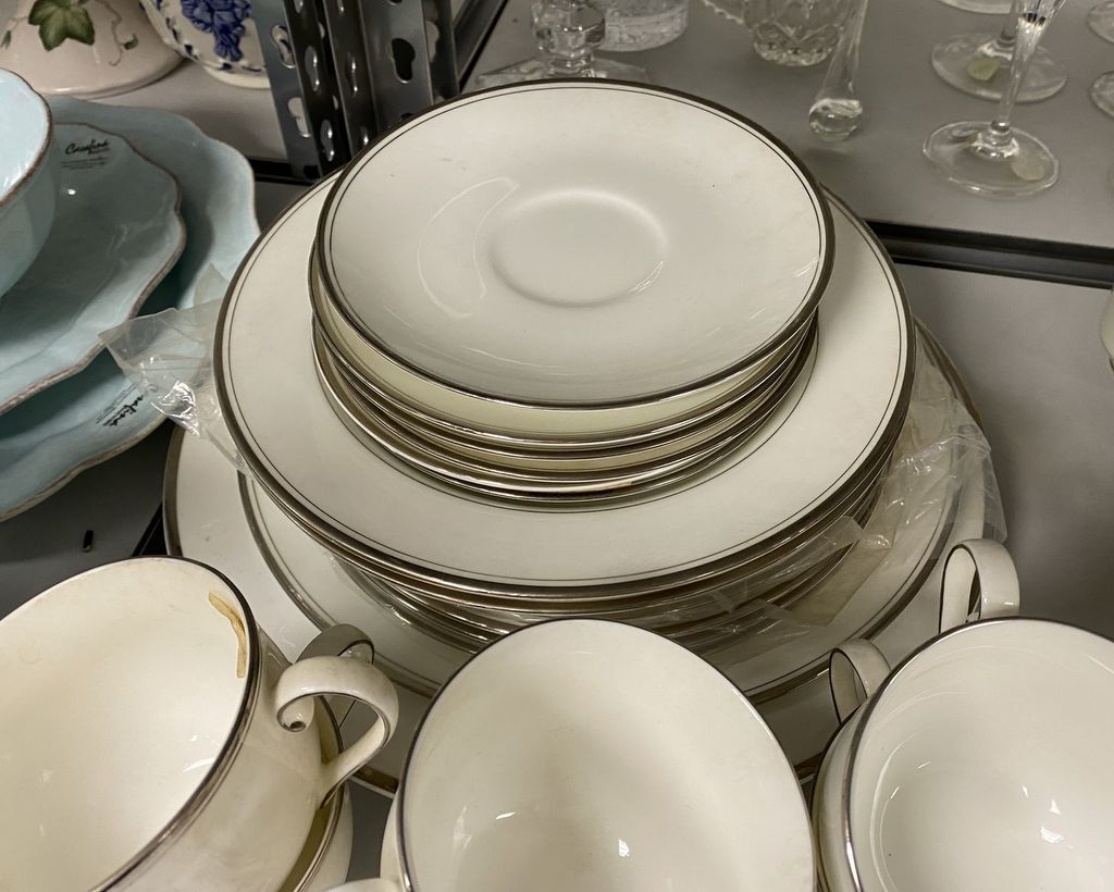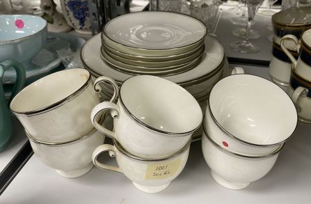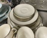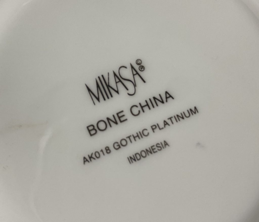 Mikasa Gothic Platinum China Set, dinner plates, salad, dessert, saucers, and cups, Location Right Metal Shelves Mikasa Gothic Platinum China Set, dinner plates, salad, dessert, saucers, and cups, Location Right Metal Shelves