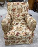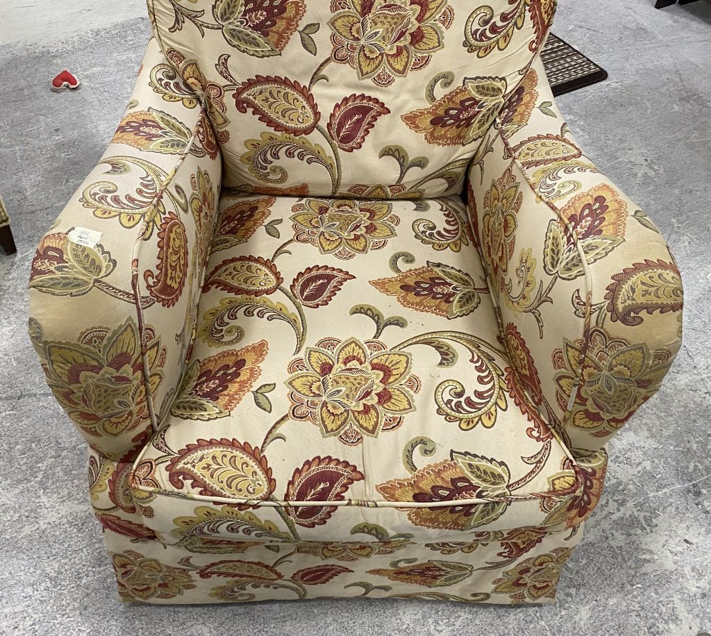 Floral Upholstery Arm Chair, fabric is dirty, Location Row 1 Floral Upholstery Arm Chair, fabric is dirty, Location Row 1