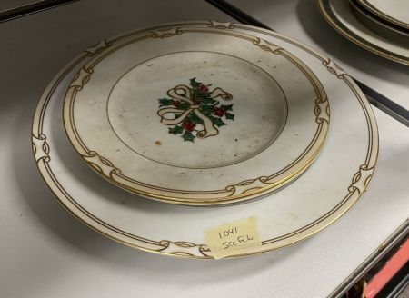 Fitz and Floyd "Winter Holly" Dinner Plate and Salad Plates, Location Right Metal Shelves Fitz and Floyd "Winter Holly" Dinner Plate and Salad Plates, Location Right Metal Shelves