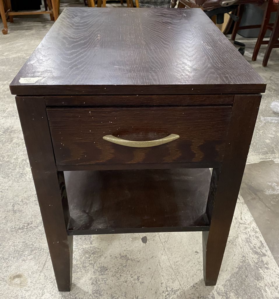 Modern Pressed Wood Farm Style Side Table, single drawer, has wear, 25"h., 18"w. Location Left Wall Modern Pressed Wood Farm Style Side Table, single drawer, has wear, 25"h., 18"w. Location Left Wall