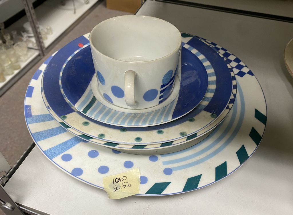 Mikasa "Trattoria" Plates, Saucer, and Cup, Location Right Metal Shelves Mikasa "Trattoria" Plates, Saucer, and Cup, Location Right Metal Shelves