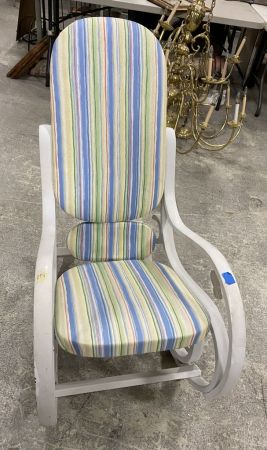Vintage Painted Victorian Rocker, striped pattern cushion. Location Row 2 Vintage Painted Victorian Rocker, striped pattern cushion. Location Row 2
