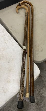 Three Vintage Wood Walking Canes, Location Back Metal Shelves Three Vintage Wood Walking Canes, Location Back Metal Shelves