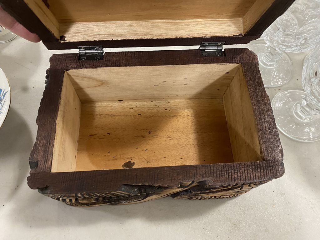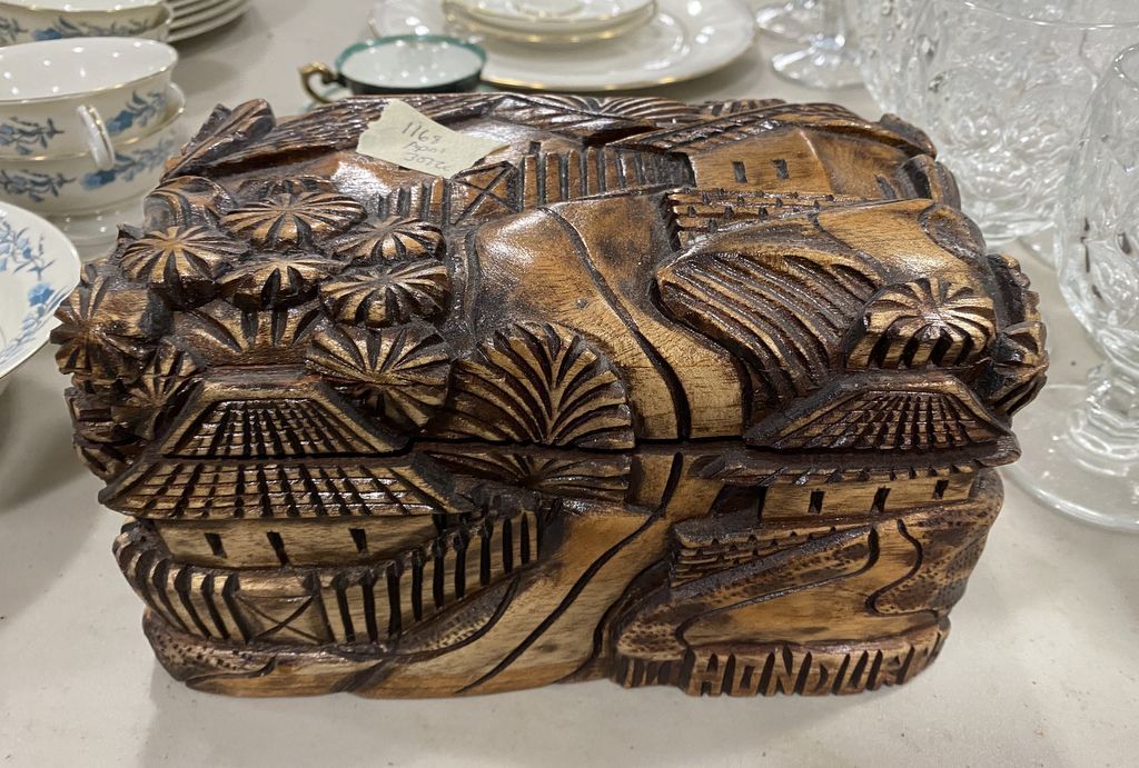 Hand Carved Wood Storage Box, 5"h., 9"w, Location Back Metal Shelves Hand Carved Wood Storage Box, 5"h., 9"w, Location Back Metal Shelves