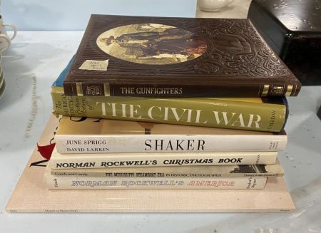 Group of Reading Books, Gunfighters, Civil War, Shaker, Norman Rockwell Christmas Book, Mississippi Steamboat, Monet, Location Back Metal Shelves Group of Reading Books, Gunfighters, Civil War, Shaker, Norman Rockwell Christmas Book, Mississippi Steamboat, Monet, Location Back Metal Shelves