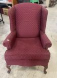 Queen Anne Red Upholstered Arm Chair, needs cleaning. Location Row 1 Queen Anne Red Upholstered Arm Chair, needs cleaning. Location Row 1