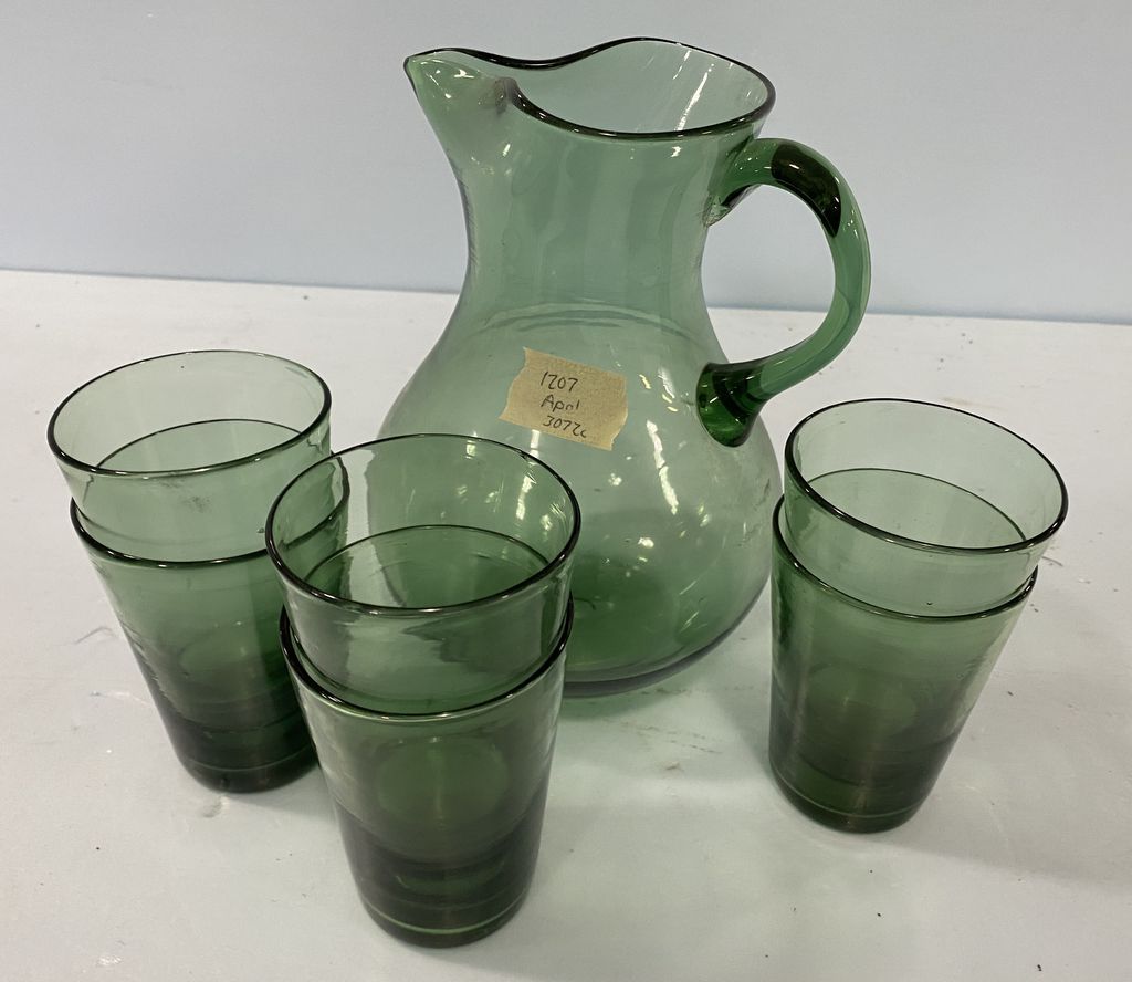 Green Glass Water Pitcher Set, 6 cups, and pitcher, Location Back Metal Shelves Green Glass Water Pitcher Set, 6 cups, and pitcher, Location Back Metal Shelves