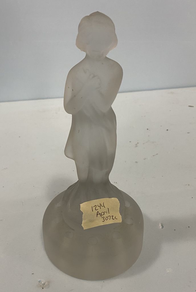 Vintage Frosted Glass Lady Figure Flower Frog, 9"h, Location Back Metal Shelves Vintage Frosted Glass Lady Figure Flower Frog, 9"h, Location Back Metal Shelves