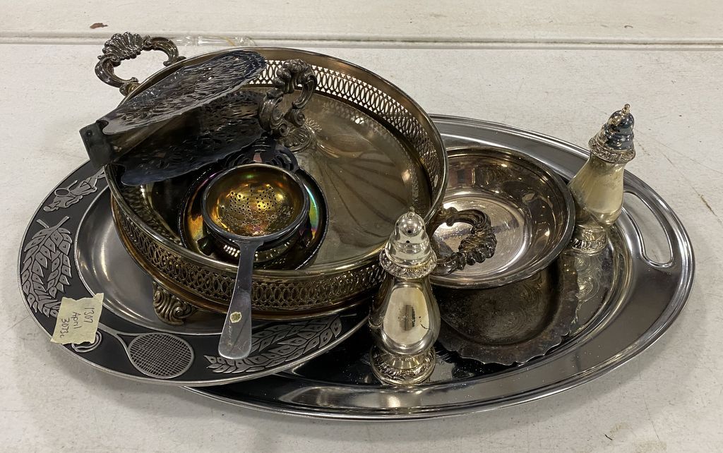 Group of Silver Plate Serving Pieces, Location Right Metal Shelves Group of Silver Plate Serving Pieces, Location Right Metal Shelves