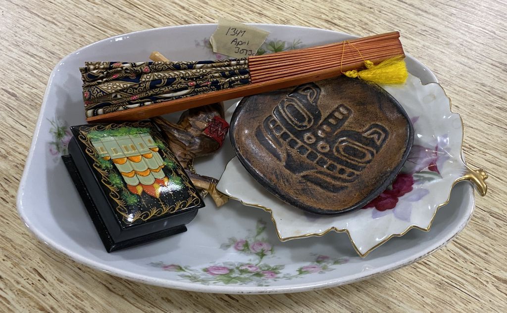 Group of Porcelain Bowl, Fan, and Dish, Location Right Metal Shelves Group of Porcelain Bowl, Fan, and Dish, Location Right Metal Shelves