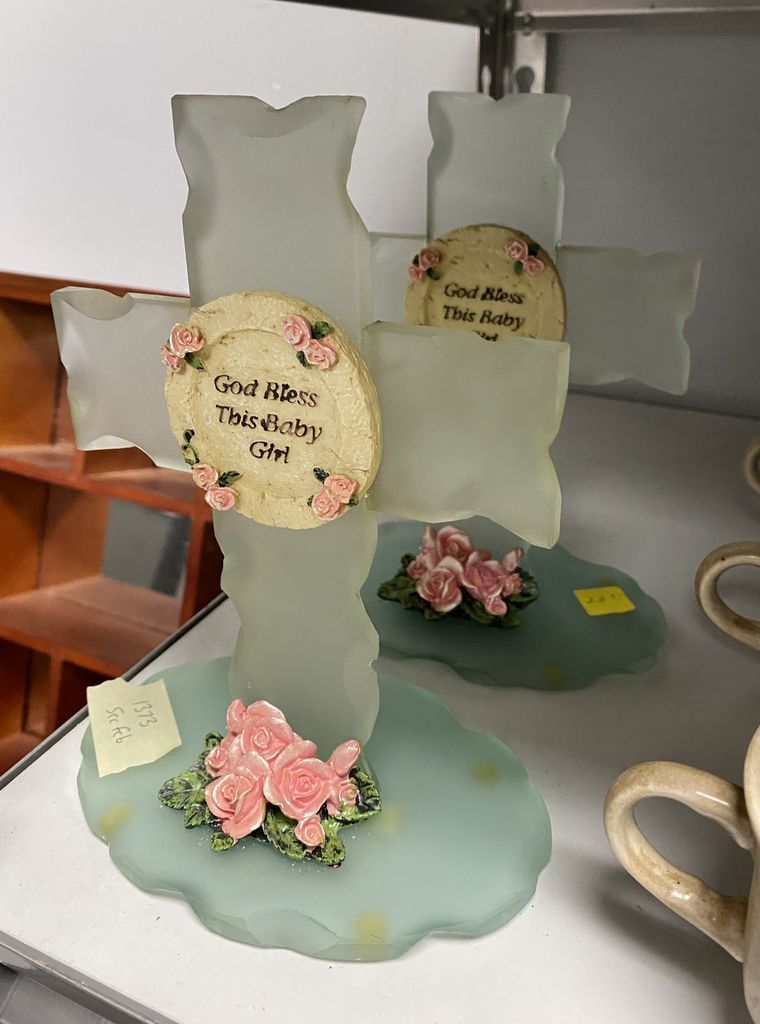 Two Glass God Bless Crosses, Location Right Metal Shelves Two Glass God Bless Crosses, Location Right Metal Shelves