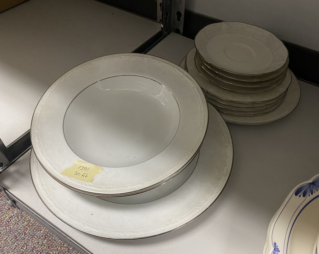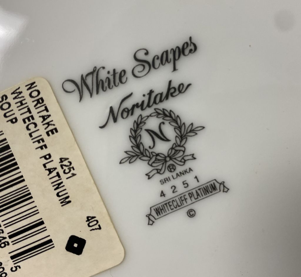 Noritake White Scapes "Whitecliff Platinum" China, Dinner Plate, Bowls, Plates, Saucers, Location Right Metal Shelves Noritake White Scapes "Whitecliff Platinum" China, Dinner Plate, Bowls, Plates, Saucers, Location Right Metal Shelves