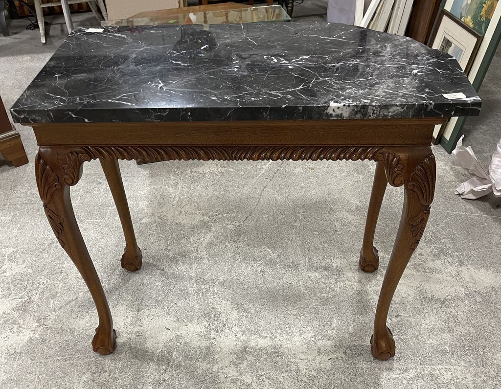 Reproduction Ball-n-Claw Faux Marble Console Table, marble is broken and damaged more than picture shows, 37"x 20" and 30" tall, Location Right Wall Reproduction Ball-n-Claw Faux Marble Console Table, marble is broken and damaged more than picture shows, 37"x 20" and 30" tall, Location Right Wall