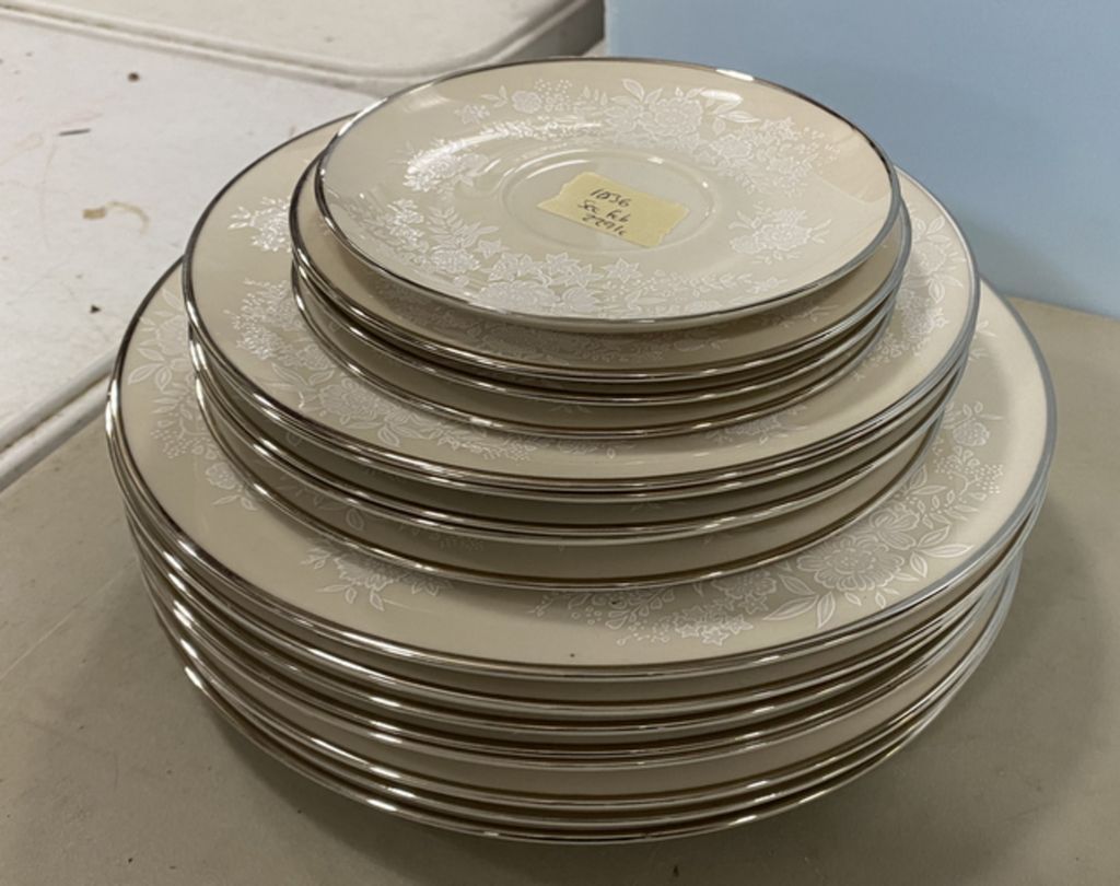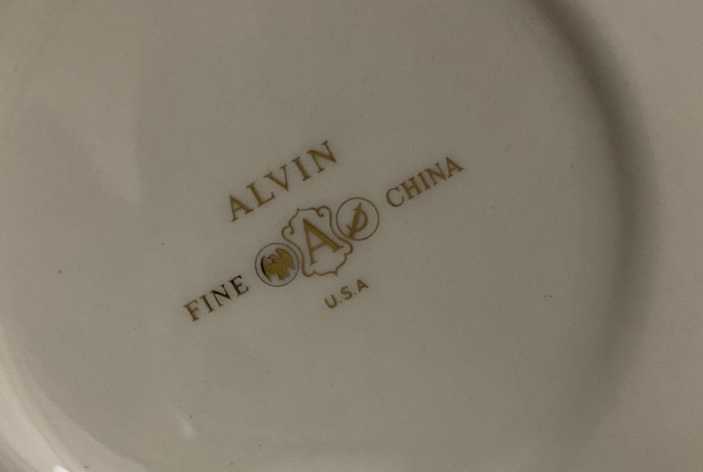 Alvin Fine China China Plates, 8 dinner plates, 5 salad plates, 4 saucers. Location Back Left Metal Shelves Alvin Fine China China Plates, 8 dinner plates, 5 salad plates, 4 saucers. Location Back Left Metal Shelves