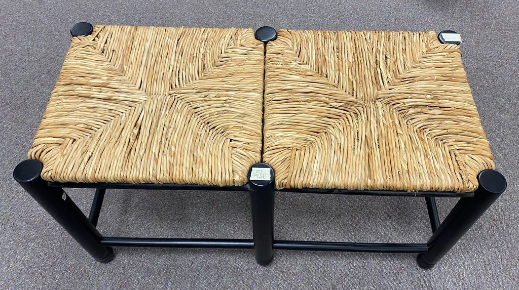 Modern Black Wood Base Bench, woven seat, 18"h., 34"w, Location Row 5 Modern Black Wood Base Bench, woven seat, 18"h., 34"w, Location Row 5