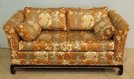 Oriental two cushion settee.; 63" w., 27" h., 34" d. Oriental two cushion settee.; 63" w., 27" h., 34" d.