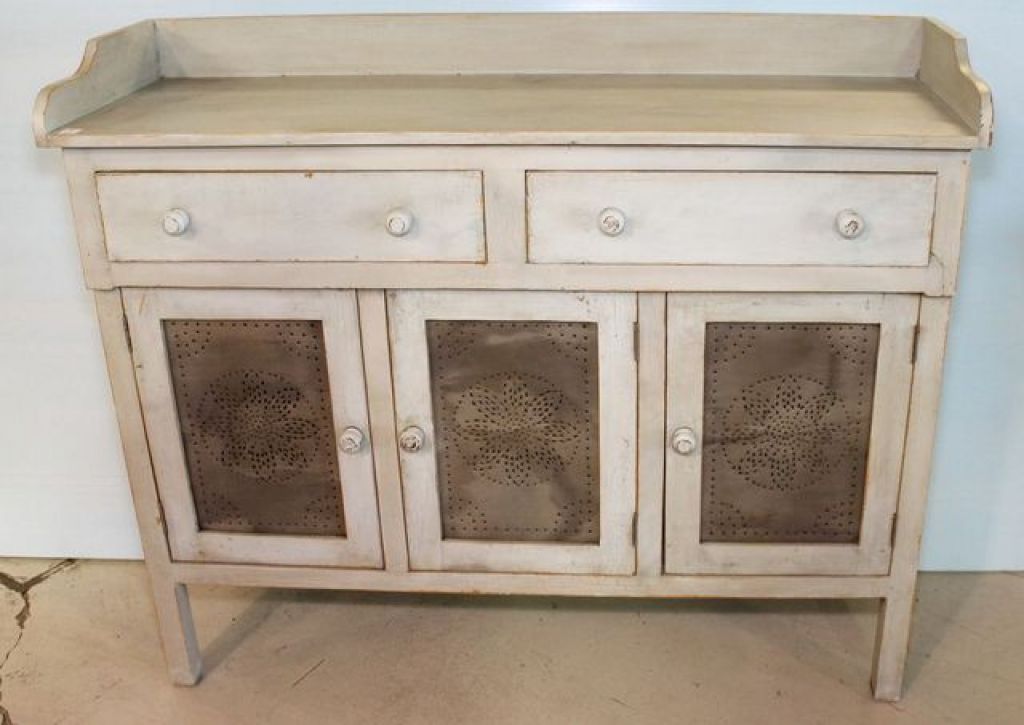 Light blue two drawers over three doors sideboard, has five punched tins.; 53" w., 44" d., 17 1/2" d. Light blue two drawers over three doors sideboard, has five punched tins.; 53" w., 44" d., 17 1/2" d.