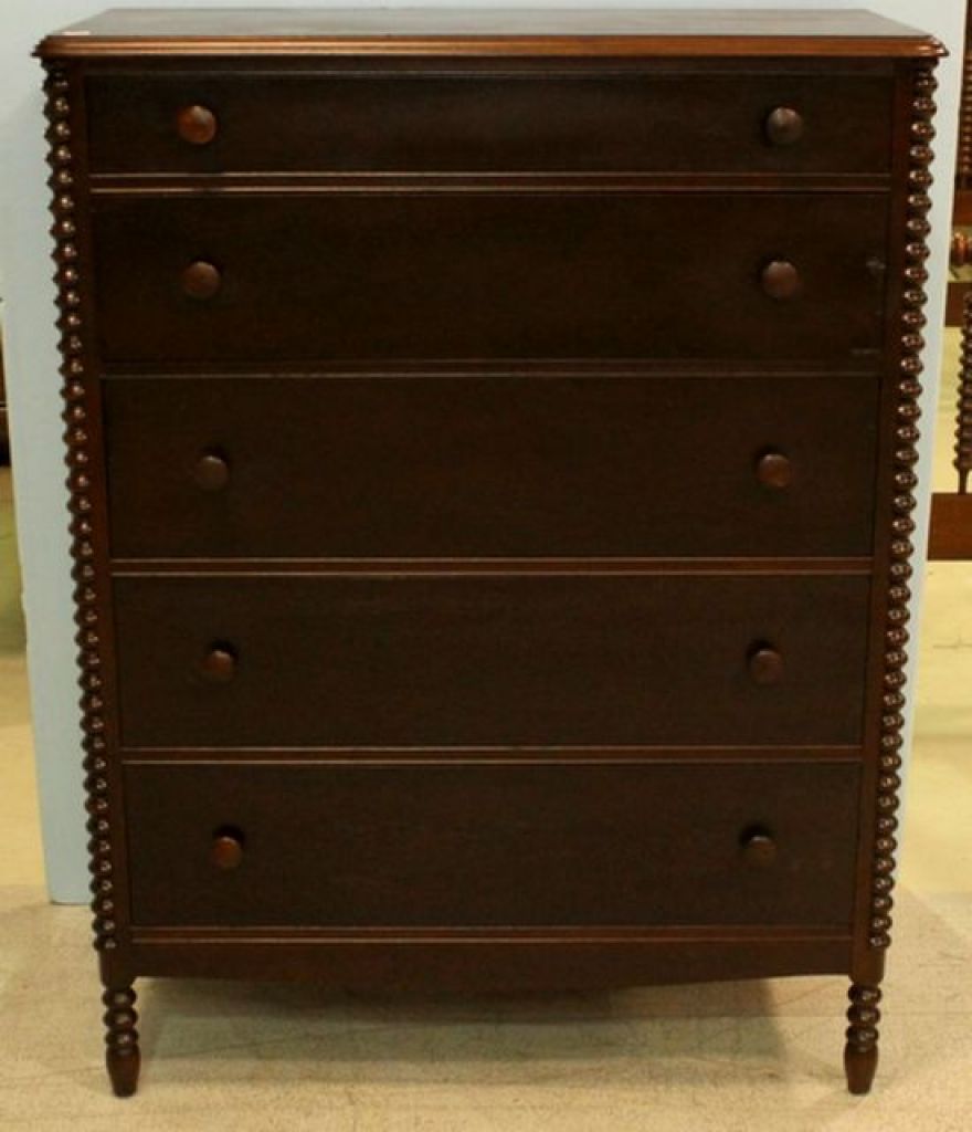 Mahogany, five drawer chest with Jenny Lind spool columns; matches lot #381 and #382; 37" w., 49" h., 19" d. Mahogany, five drawer chest with Jenny Lind spool columns; matches lot #381 and #382; 37" w., 49" h., 19" d.