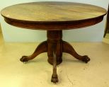 Round oak clawfoot dining table; 48" dia., 30" h. Round oak clawfoot dining table; 48" dia., 30" h.
