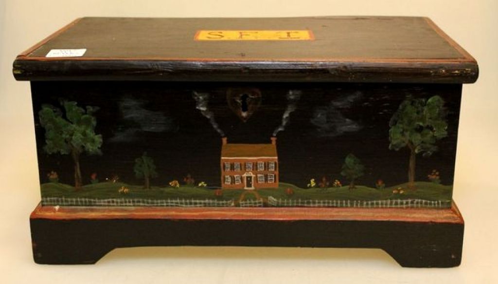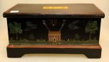 House scene painted on wood hinged top box.; 12 1/2" w., 6" h., 7" d. House scene painted on wood hinged top box.; 12 1/2" w., 6" h., 7" d.