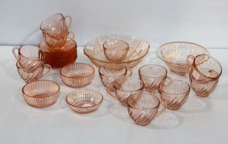 733 Twelve Pink Araroc France Cups/Saucer & Five Pink Depression Bowls