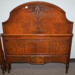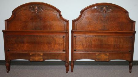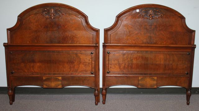 Pair of 20th Century Walnut Twin Beds, beds have headboard carving and beautiful veneer, with wood rails; 39 1/2" w., 18 1/2" d., 63 1/2" h. Pair of 20th Century Walnut Twin Beds, beds have headboard carving and beautiful veneer, with wood rails; 39 1/2" w., 18 1/2" d., 63 1/2" h.