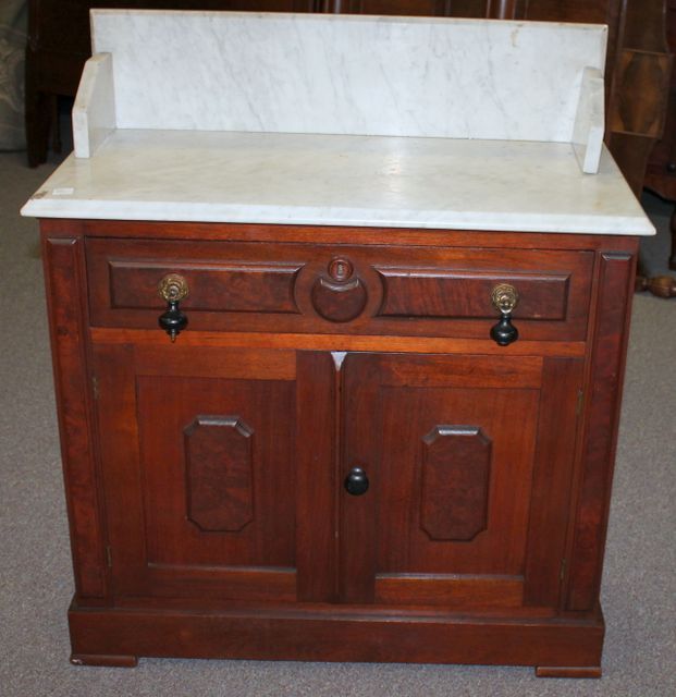 Victorian Marble Top Washstand, one drawer over two doors, teardrop pulls; 31" w., 15 1/2" d., 36" h. Victorian Marble Top Washstand, one drawer over two doors, teardrop pulls; 31" w., 15 1/2" d., 36" h.