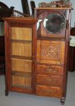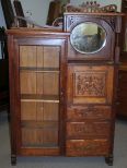 20th Century Oak Side by Side Secretary, over three drawers with round beveled mirror, other side having three shelves; 44" w., 13" d., 66" h. 20th Century Oak Side by Side Secretary, over three drawers with round beveled mirror, other side having three shelves; 44" w., 13" d., 66" h.