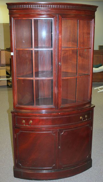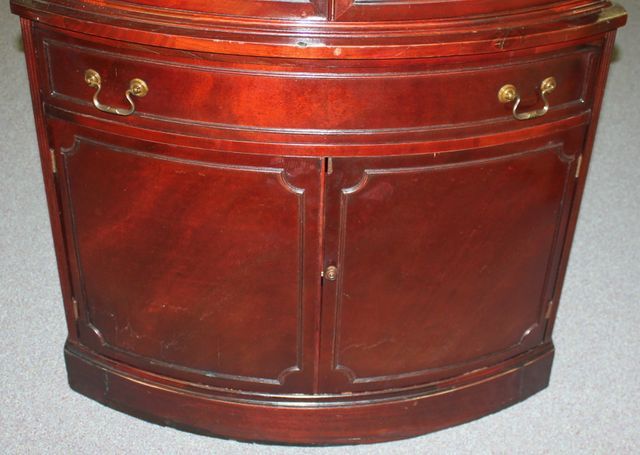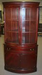 20th Century Mahogany Corner Cabinet, with two top curved glass doors, divided glass section, center drawer over two doors; 35" w., 71 1/2" h., 15" d. 20th Century Mahogany Corner Cabinet, with two top curved glass doors, divided glass section, center drawer over two doors; 35" w., 71 1/2" h., 15" d.