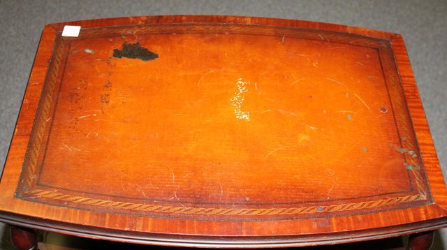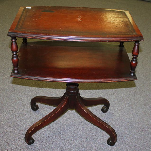 20th Century Duncan Phyfe Style Parlor Table, leather top, one shelf, spider legs, has a spot on the leather; 23 1/2" w., 17 1/2" d., 27" h. 20th Century Duncan Phyfe Style Parlor Table, leather top, one shelf, spider legs, has a spot on the leather; 23 1/2" w., 17 1/2" d., 27" h.