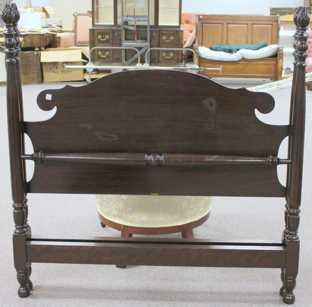 20th Century Mahogany Standard (Double) Bed with Flame Finials, has wood rails; 56 1/2" h. 20th Century Mahogany Standard (Double) Bed with Flame Finials, has wood rails; 56 1/2" h.