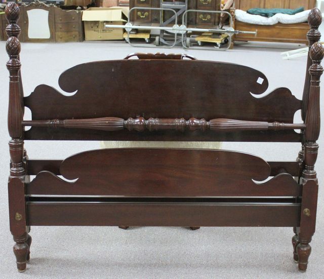 20th Century Mahogany Full Size (Double) Bed with Pineapple Finials, has wood rails; 49" h. 20th Century Mahogany Full Size (Double) Bed with Pineapple Finials, has wood rails; 49" h.