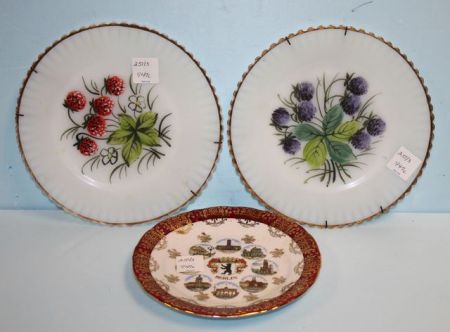 251 Two Milk Glass Plates with Painted Fruit along with German Plate of Berlin