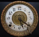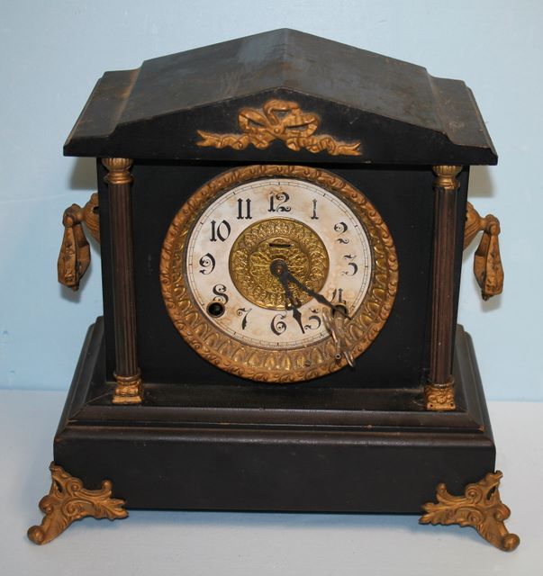 Vintage Mantel Clock, clock needing restoration, brass feet and decoration, key, no glass; 11 1/2" w., 12" h. Vintage Mantel Clock, clock needing restoration, brass feet and decoration, key, no glass; 11 1/2" w., 12" h.