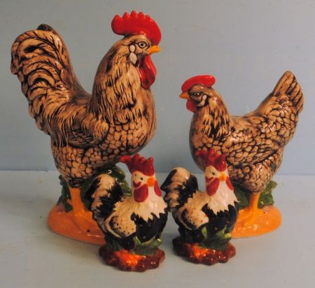 Four Ceramic Roosters (4", 6" h.) two of which are salt and peppers (4 1/2" h.) Four Ceramic Roosters (4", 6" h.) two of which are salt and peppers (4 1/2" h.)