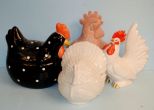 Pottery Terra Cotta Color Wall Rooster 7 1/2" w., 9" h., ceramic white turkey 7" h., covered rooster container 8' w., 10' h., white ceramic rooster 9 1/2" h. Pottery Terra Cotta Color Wall Rooster 7 1/2" w., 9" h., ceramic white turkey 7" h., covered rooster container 8' w., 10' h., white ceramic rooster 9 1/2" h.