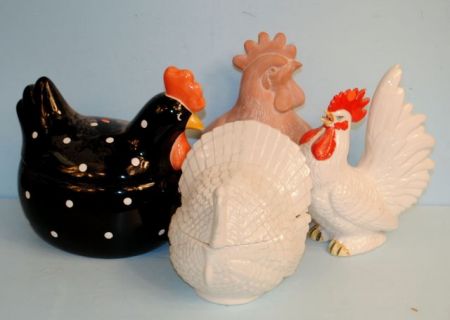311 Pottery Terra Cotta Color Wall Rooster, Ceramic White Turkey, Covered Rooster Container and a White Ceramic Rooster