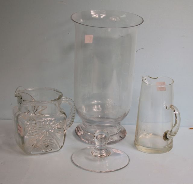 Group of Glass Items; glass vase 12 1/2" h., 7" dia., glass pitcher 6" h., 5 1/2" dia., glass pitcher 7 1/2" h., 3" dia., glass lid Group of Glass Items; glass vase 12 1/2" h., 7" dia., glass pitcher 6" h., 5 1/2" dia., glass pitcher 7 1/2" h., 3" dia., glass lid