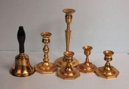 Group of Brass Items; brass hand bell 6 1/2" h., three brass candlesticks 2 1/2" h., one brass candlestick with octagonal base 5" h., one brass candlestick 7 7/8" h. Group of Brass Items; brass hand bell 6 1/2" h., three brass candlesticks 2 1/2" h., one brass candlestick with octagonal base 5" h., one brass candlestick 7 7/8" h.