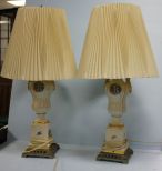 Pair of Vintage Table Lamps on Brass Bases, transfer French scene with shades; 30" h., including shade Pair of Vintage Table Lamps on Brass Bases, transfer French scene with shades; 30" h., including shade