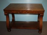 Victorian Oak Library Table, with lower shelf, "S" scroll legs, bun feet; 42" w., 26" d., 30" h. Victorian Oak Library Table, with lower shelf, "S" scroll legs, bun feet; 42" w., 26" d., 30" h.
