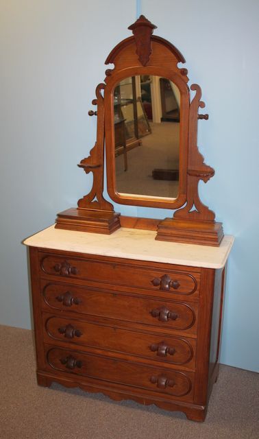 Victorian Walnut and Chestnut Marble Top Dresser, with unique wood carved pulls, glove boxes; 39" w., 18 1/2" d., 76" h. Victorian Walnut and Chestnut Marble Top Dresser, with unique wood carved pulls, glove boxes; 39" w., 18 1/2" d., 76" h.