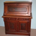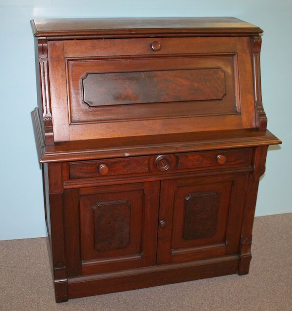 Victorian Walnut Fall Front Desk with Interior Cubby Holes, center drawer over two doors; 37 1/2" w., 21" d., 45 1/2" h. Victorian Walnut Fall Front Desk with Interior Cubby Holes, center drawer over two doors; 37 1/2" w., 21" d., 45 1/2" h.