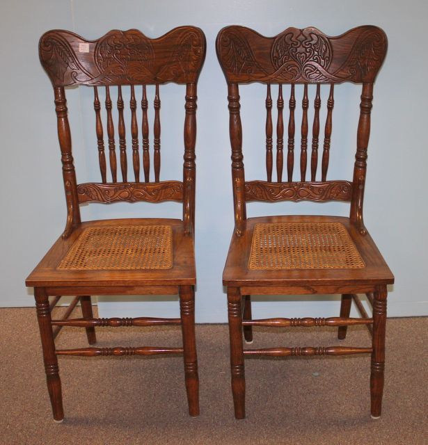 Two Oak Carved Side Chairs; 16" w., 16" d., 39" h. Two Oak Carved Side Chairs; 16" w., 16" d., 39" h.