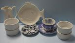 Nine Porcelain Pieces, including; fish shaped dish 7 7/8" w., tour ramekins 3 1/2" dia., blue and white dish 5" dia., blue and white cup with saucer 5 7/8" dia. Nine Porcelain Pieces, including; fish shaped dish 7 7/8" w., tour ramekins 3 1/2" dia., blue and white dish 5" dia., blue and white cup with saucer 5 7/8" dia.