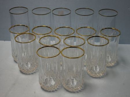 Sixteen Glasses, Mikasa "Gold Crown" 5-7" h., eleven tumblers 5 1/2" Sixteen Glasses, Mikasa "Gold Crown" 5-7" h., eleven tumblers 5 1/2"