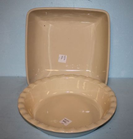 Two Natural Element Pans; 10 1/2" pie pan, 10" square casserole - appears to be porcelain Two Natural Element Pans; 10 1/2" pie pan, 10" square casserole - appears to be porcelain